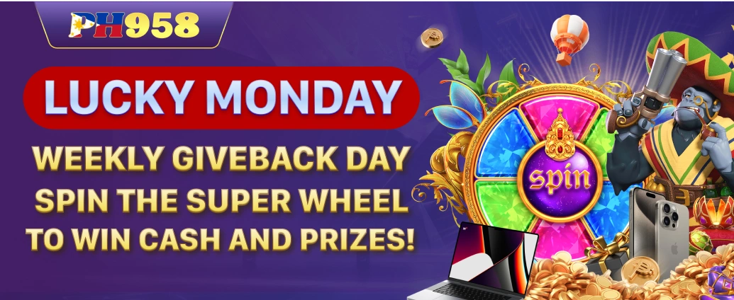 Ipagdiwang ang Maswerteng Lunes sa PH958 kasama ang aming lingguhang araw ng pagbibigay! Paikutin ang Superwheel para sa iyong pagkakataong manalo ng mga premyong pera at kapanapanabik na gantimpala. Ito ang perpektong paraan upang simulan ang iyong linggo at palakasin ang iyong laro gamit ang ligtas na online na plataporma ng pagsusugal ng PH958 at mga nangungunang laro.